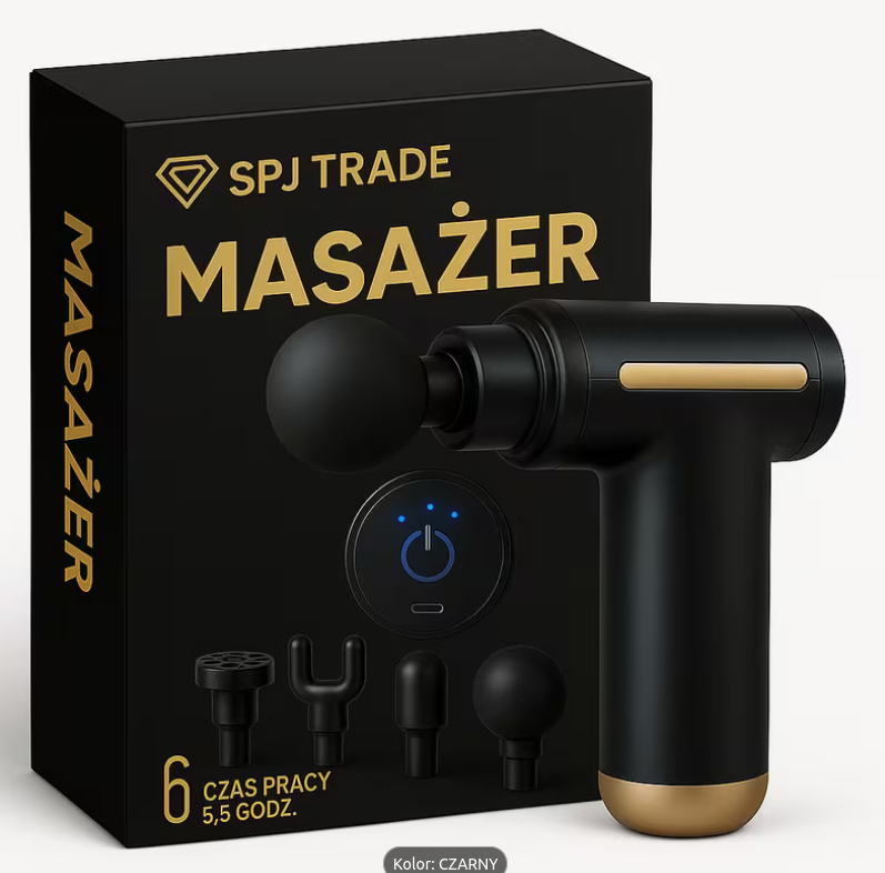 Pistolet do Masażu Pleców, Mięśni i Karku – Bezprzewodowy, USB, 6 Trybów, 4 Końcówki Opis produktu: Nowoczesny, kompaktowy i bardzo wydajny masażer punktowy to idealne urządzenie do regeneracji mięśni całego ciała. Dzięki 6 poziomom intensywności (1800–3200 r/min) i 4 wymiennym końcówkom, sprawdzi się zarówno do relaksu po treningu, jak i w leczeniu spiętych, bolesnych partii ciała. Bezprzewodowa konstrukcja, zasilanie akumulatorowe i ładowanie przez USB-C zapewniają wygodę użytkowania w każdych warunkach – w domu, podróży lub gabinecie. Specyfikacja techniczna: Zasilanie: akumulatorowe (litowo-jonowe) Moc: 25W Rodzaj masażu: punktowy, wibracyjny Poziomy intensywności: 6 (1800–3200 r/min) Końcówki w zestawie: 4 różne końcówki masujące Wskaźnik prędkości: niebieska dioda LED Ładowanie: USB-C (uniwersalne i szybkie) Typ: bezprzewodowy pistolet do masażu