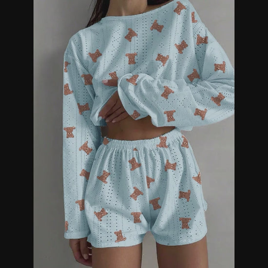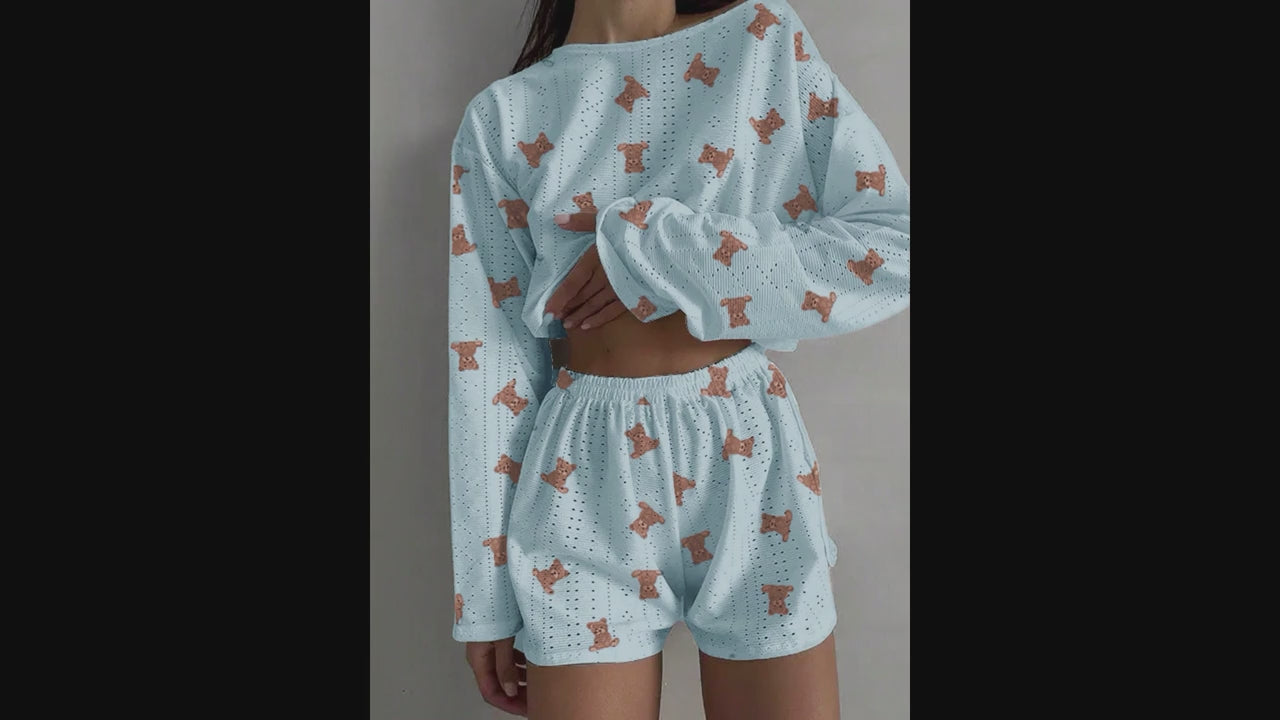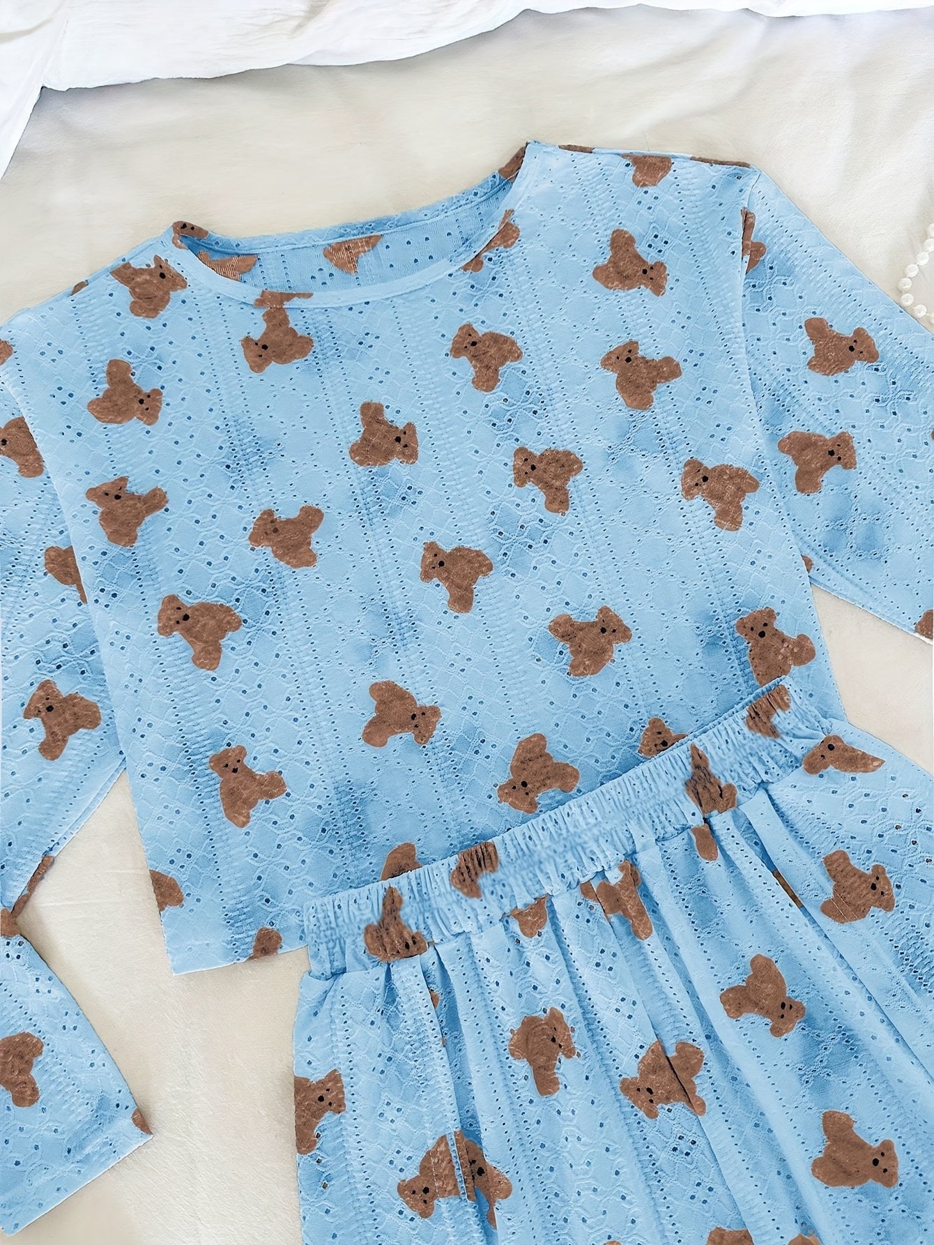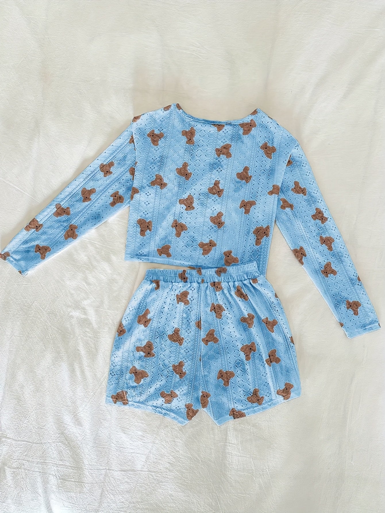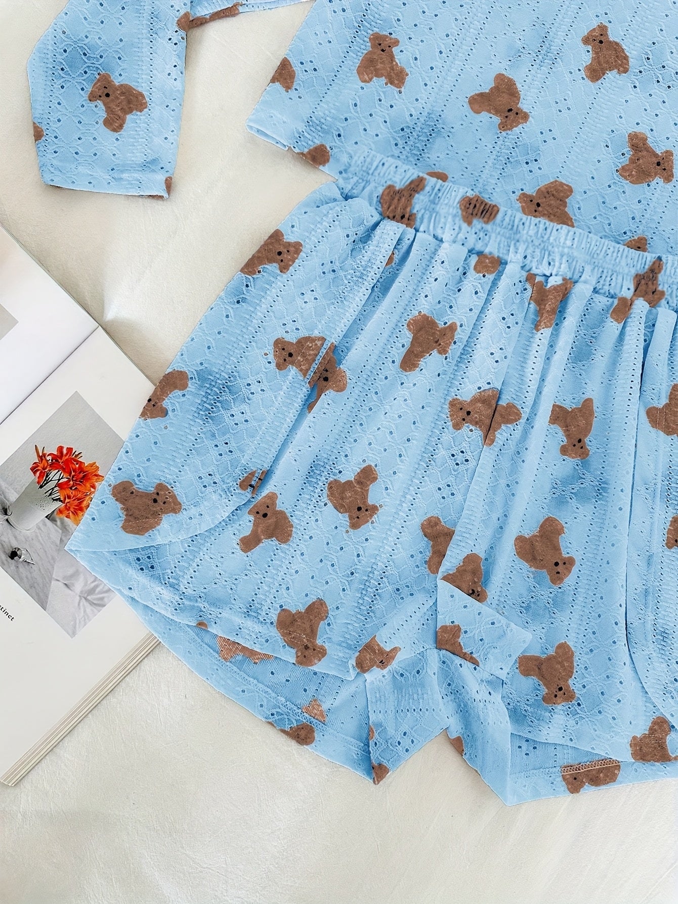 Komfortowy Półprzezroczysty Komplet Piżamy z Nadrukiem Misia, Długi Rękaw, Okrągły Dekolt, Szorty z Rozcięciem Bocznym