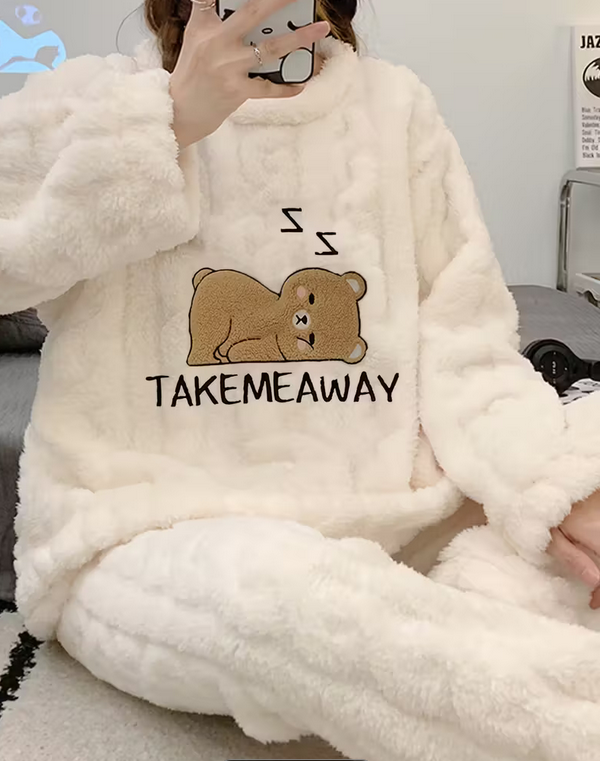 Komplet Piżam z Polarowym Koralikiem dla Nastolatków z Długimi Rękawami i Spodniami, Gruby Ciepły Wygodny Haftowany Uroczy Wzór Misia