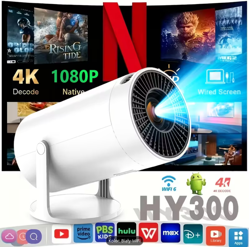 Projektor Pro 2025 | Wbudowany System Android 11, Natywna Rozdzielczość 1080P, Obsługa Dekodowania 4K, Elastyczny Obrot 180°, Montaż Podłogowy, Zdalnego Sterowania, Łączność Bezprzewodowa, Jasność 300 ANSI, Proporcje Obrazu 16:9