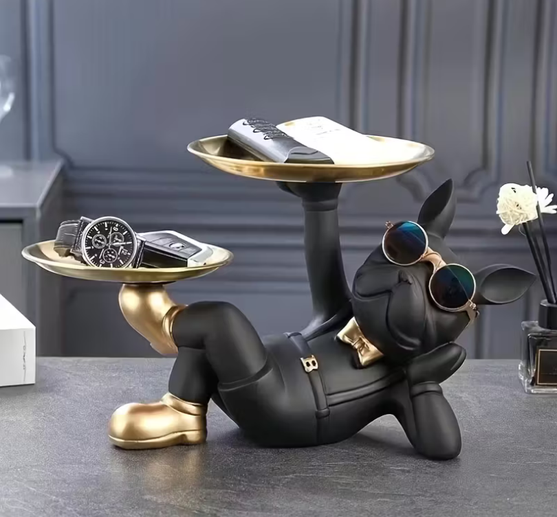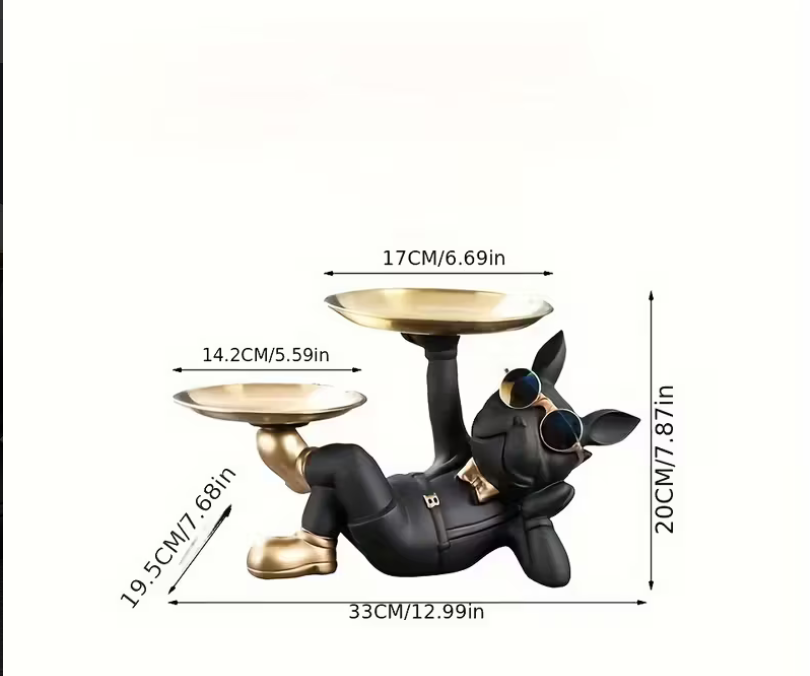 Statua Buldoga Francuskiego, Czarna, z Okularami i dwie tace na Klucze, Odpowiednia do Dekoracji Biurka w Domu, Prezent na Boże Narodzenie