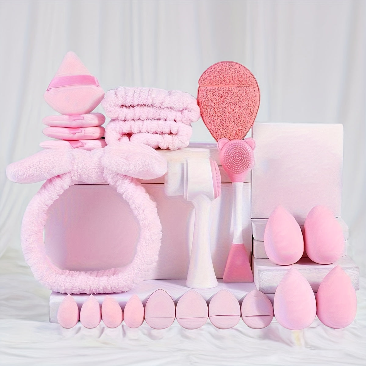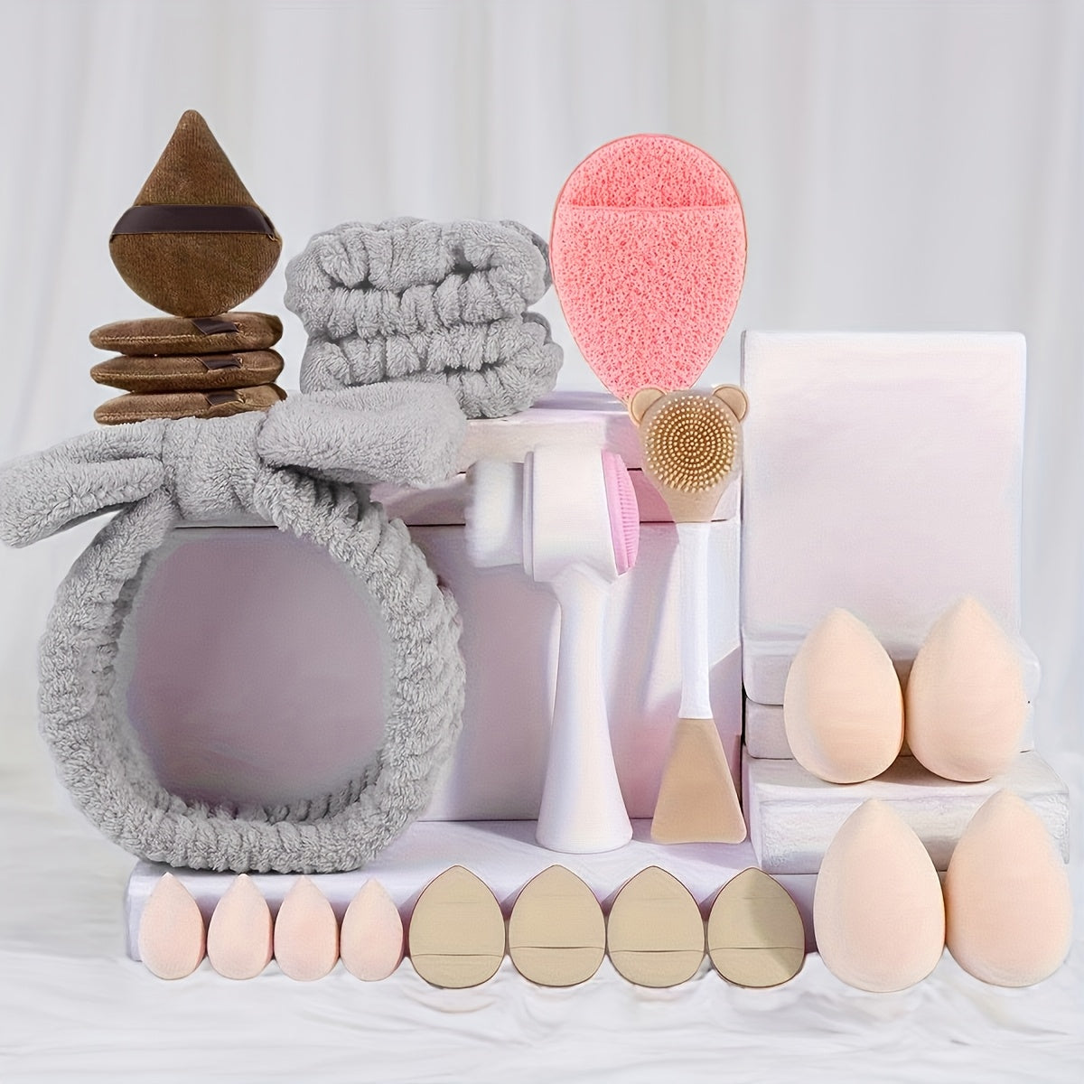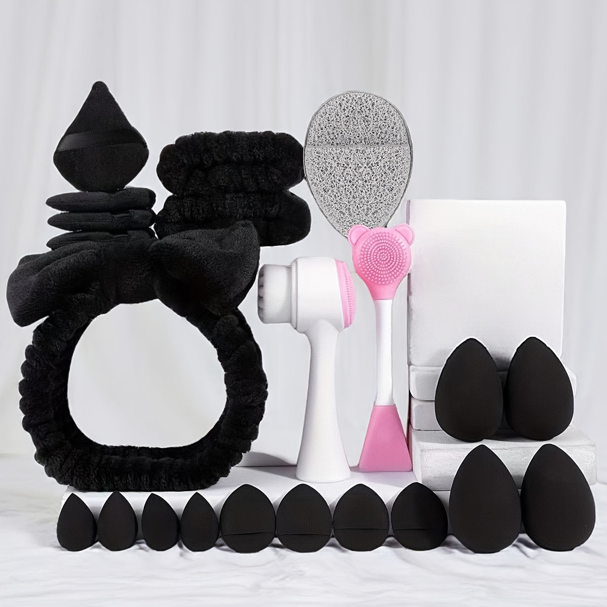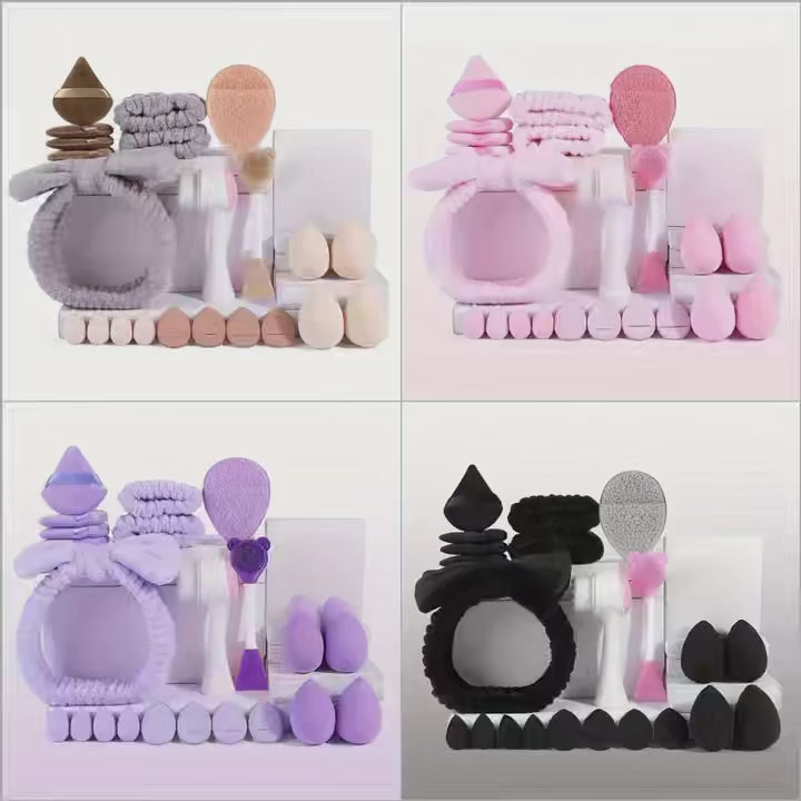 22 szt. Profesjonalny zestaw do oczyszczania twarzy i makijażu, w tym 4 duże beauty blenderki, 4 puszki do pudru, 4 mini beauty blenderki, 4 puszki do pudru na palec, 3 opaski do mycia twarzy, 1 szczotka do mycia twarzy, 1 szczotka do maseczek, 1 puszek do mycia twarzy, przenośny zestaw podróżny