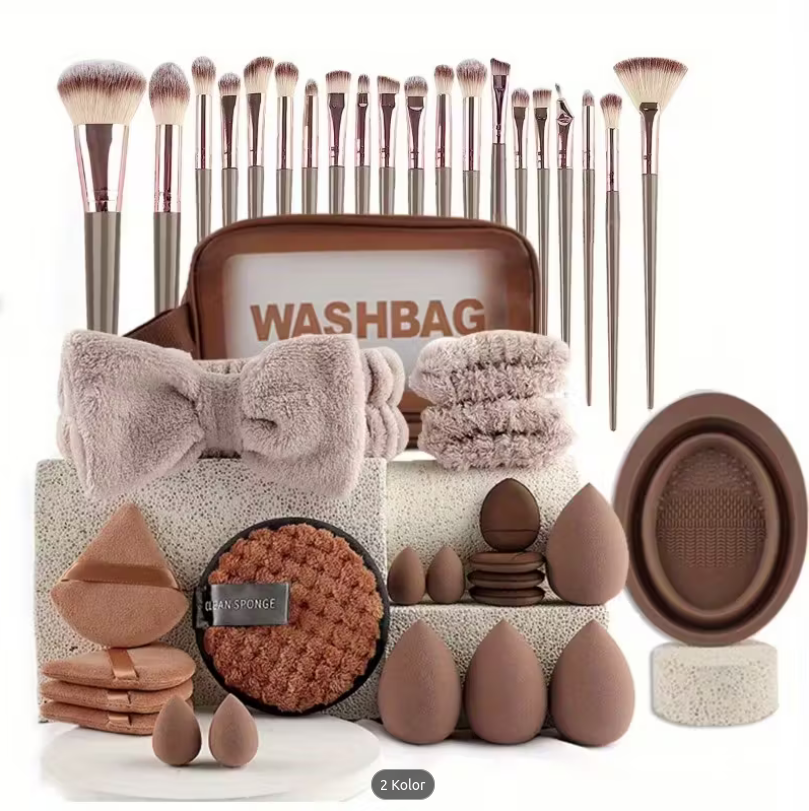 Zestaw do makijażu twarzy i oczu, 42 sztuki, w tym 20 pędzli, opaski na głowę, bransoletki, duże i małe gąbki kosmetyczne, wachlarze i kciukowe puszek, oraz miska do czyszczenia pędzli i kosmetyczka