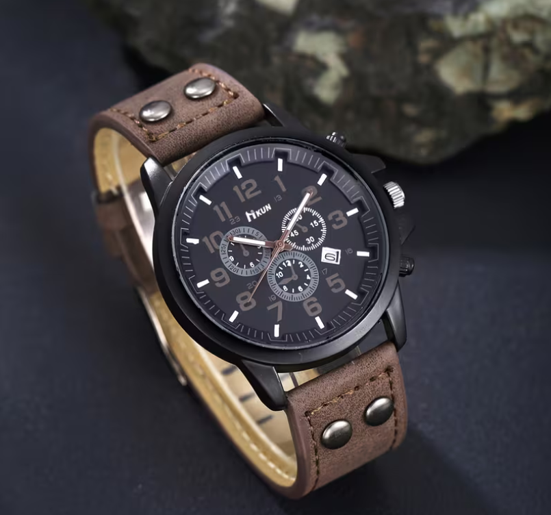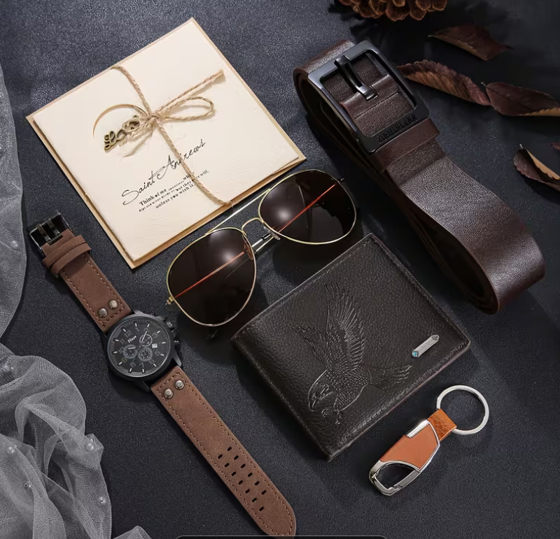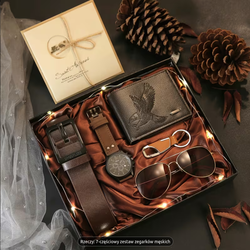 7-częściowy męski zegarek kwarcowy + pasek, portfel, okulary, kluczyk, kartka z życzeniami, światło atmosferyczne