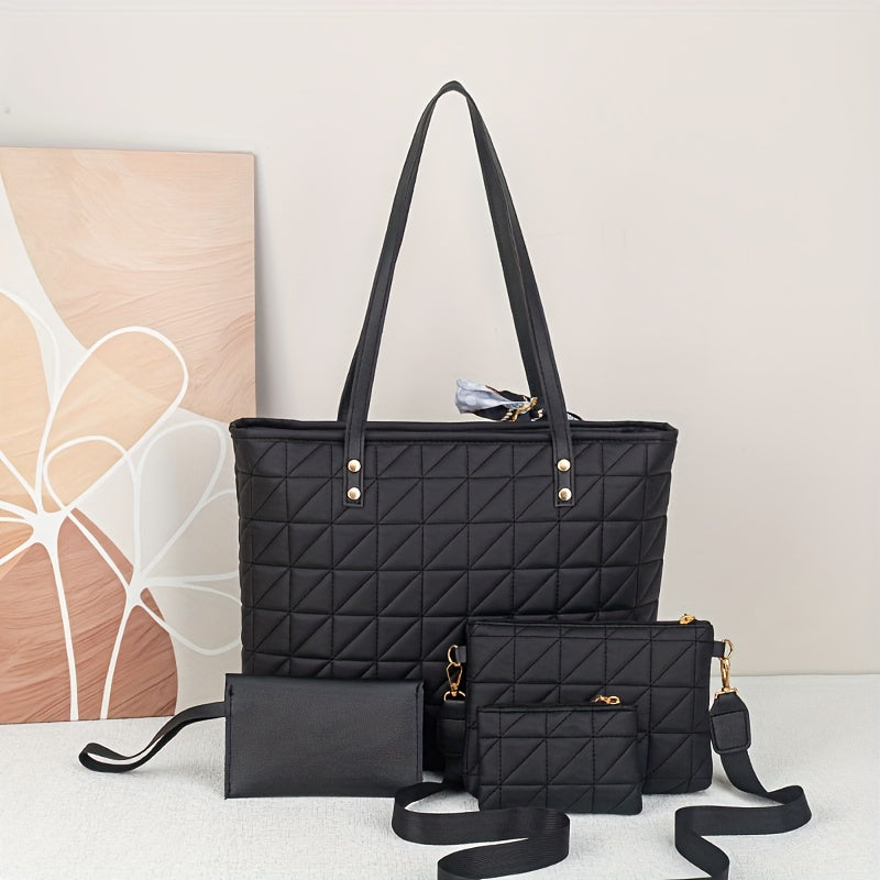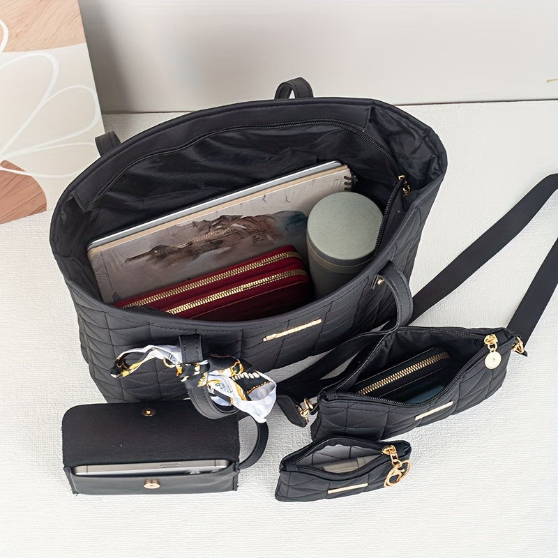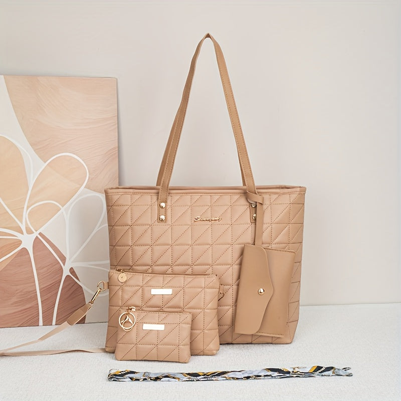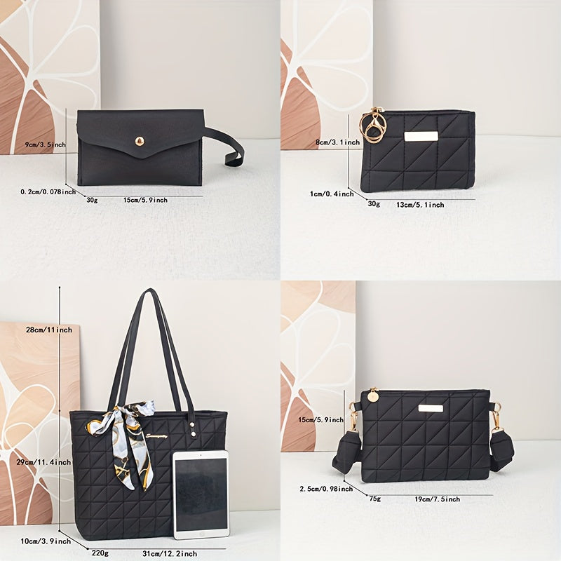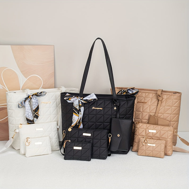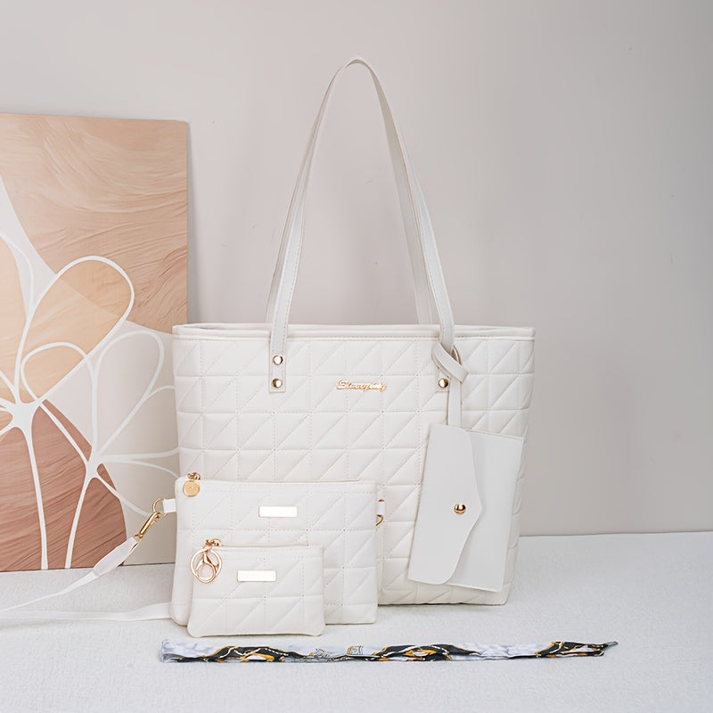 Elegancki Zestaw Torebek Damskich - Duża Torba, Listonoszka, Portfel i Saszetka z Pozłacanym Wykończeniem w Kolorach Beż/Biały/Czarny/Brązowy, Suwak oraz Pasek na Kokardę – Wyszukana Kolekcja Prezentowa